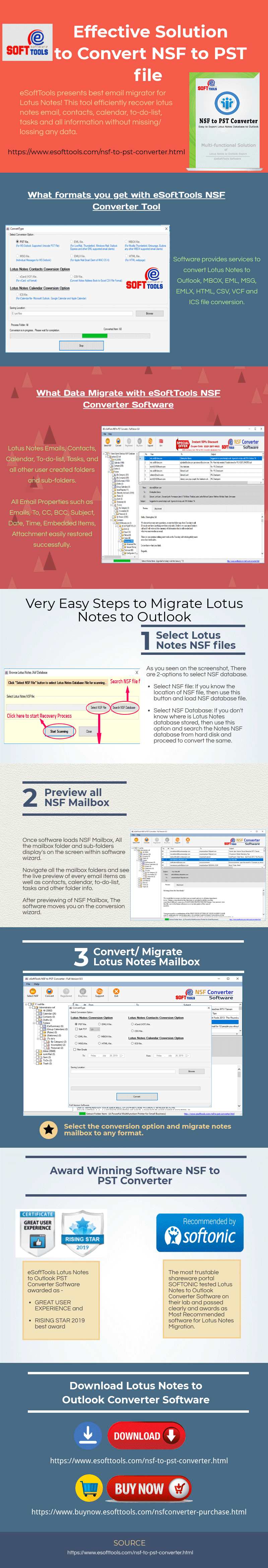 You can easily download this wonderful application called eSoftTools NSF to PST Converter Software that will perfectly make the recovery or conversion NSF file to PST Outlook with just applying some simple steps. It provides the facility to convert the NSF file with selective single or multiple mailbox items of Lotus Notes NSF file into multiple readable file formats such as- PST, EML, EMLX, MSG, HTML, etc.